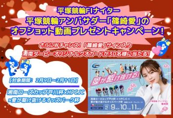 さらに、購入条件を達成した方全員にもれなく平塚競輪アンバサダー「篠崎愛」オフショット動画をプレゼント! キャンペーンの詳細、アンバサダーについては下記をご確認ください。