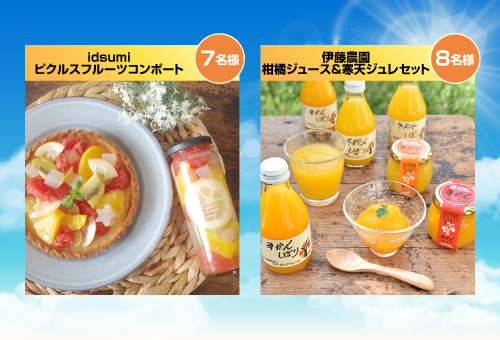 | 賞品 | 抽選で毎日7名様(期間中合計49名様)に「idsumiピクルス フルーツコンポート」を、8名様(期間中合計56名様)に「伊藤農園 柑橘ジュース&寒天ジュレセット」のいずれかをプレゼント。 |
