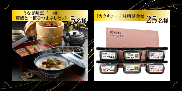 | 賞品 | 抽選で5名様に「うなぎ割烹一愼 蒲焼と一愼ひつまぶしセット」を、抽選で25名様に「カクキュー 味噌詰合せ」をプレゼント! |