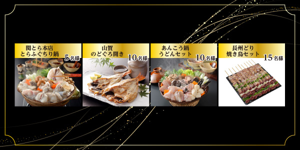 | 賞品 | 抽選で5名様に「関とら本店 とらふぐちり鍋」を、10名様に「あんこう鍋うどんセット」を、10名様に「山賀 のどぐろ開き」、15名様に「長州どり 焼き鳥セット」をプレゼント |