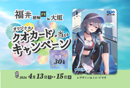 【対象開催:大垣F2(福井市営) 4月13日~15日】対象開催を合計3,000円以上購入すると、抽選で30名様に福井けいりん公式Vtuber「時風リン」デザインのオリジナルクオカードをプレゼント!