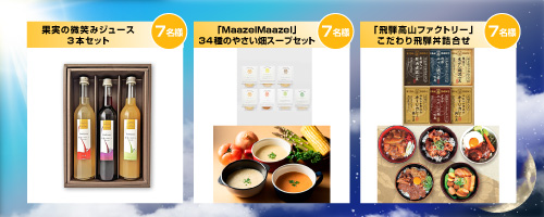 | 賞品 | 抽選で毎日7名様(期間中合計49名様)に「果実の微笑みジュース3本セット」を、7名様(期間中合計49名様)に「MaazelMaazel 34種のやさい畑スープセット」を、7名様(期間中合計49名様)に「飛騨高山ファクトリー こだわり飛騨丼詰合せ」のいずれかをプレゼント。 |