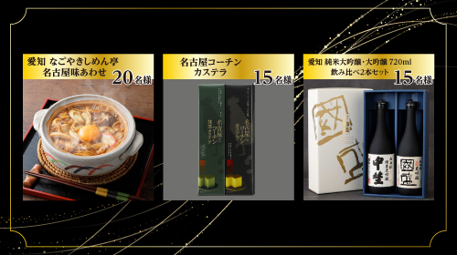 | 賞品 | 抽選で20名様に「愛知 なごやきしめん亭 名古屋味あわせ」を、15名様に「名古屋コーチン カステラ」を、15名様に「愛知 純米大吟醸・大吟醸 720ml飲み比べ2本セット」をプレゼント! |